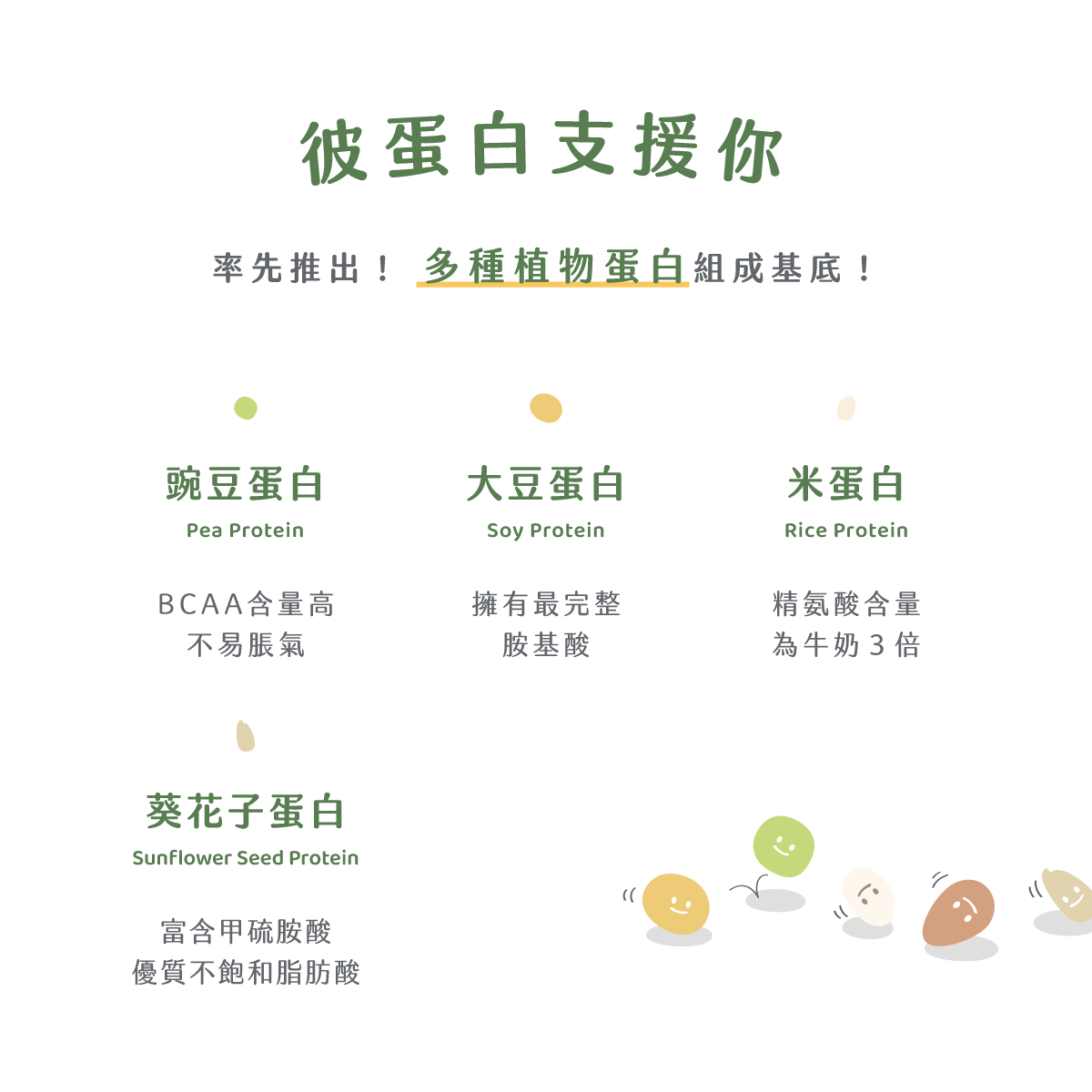 分離大豆蛋白、豌豆蛋白、素食奶精(不含乳)(葡萄糖漿、完全氫化植物油(椰子油)、辛烯基丁二酸鈉澱粉、磷酸氫二鉀、脂肪酸甘油酯、二氧化矽、β-胡蘿蔔素)、豆漿粉、難消化性麥芽糊精、玉米澱粉、香料、二氧化矽、米蛋白、葵花子蛋白、沙漠湖鹽、綜合礦物質(碳酸鈣、氧化鎂、焦磷酸鐵、葡萄糖酸鋅、酵母硒、酵母鉻)、綜合維生素(維生素C、E、B3、A、B12、D3、K1、B6、B1、B2、葉酸、B7)、乳酸菌粉(B.lactis、L.rhamnosus、L.paracasei)、綜合消化酵素(麥芽糊精、澱粉酶、乳糖酶、水、纖維素酶、蛋白酶、脂肪酶)、蔗糖素(甜味劑)、醋磺內酯鉀(甜味劑)