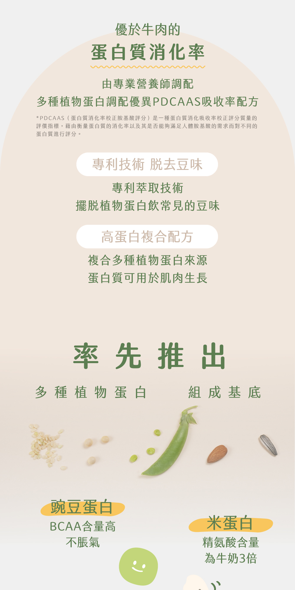 • 複合式植物蛋白,保留豐富植物營養與蛋白比例